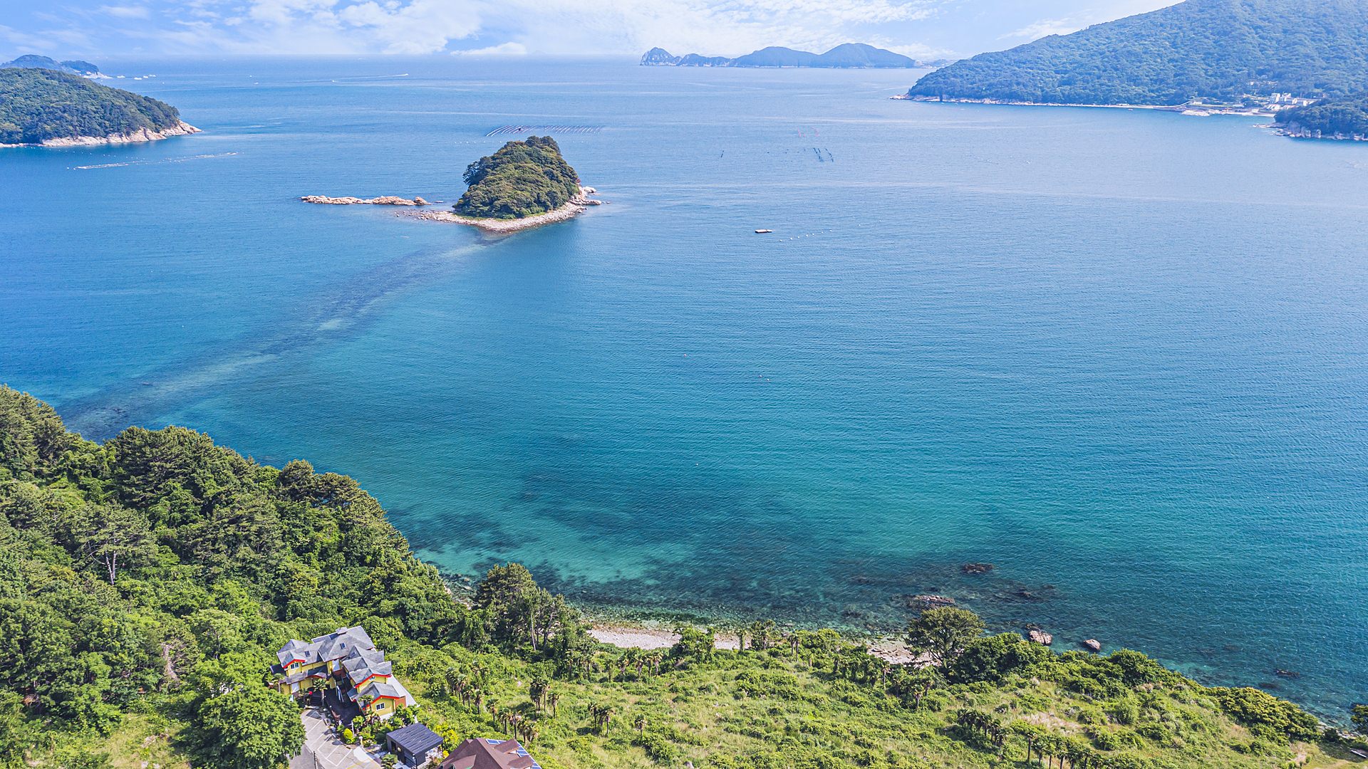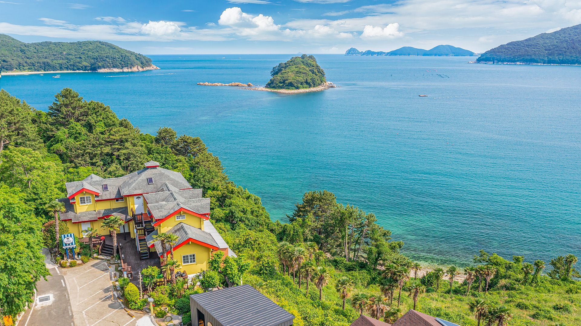 아라솔 펜션 객실과 테라스 사이로 환상적인 윤돌섬과 거제 해금강 등이